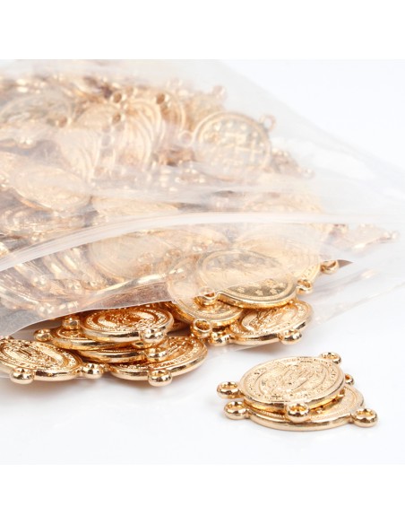 Fundición dorado con forma de medalla de virgen de Guadalupe con triple agarre.